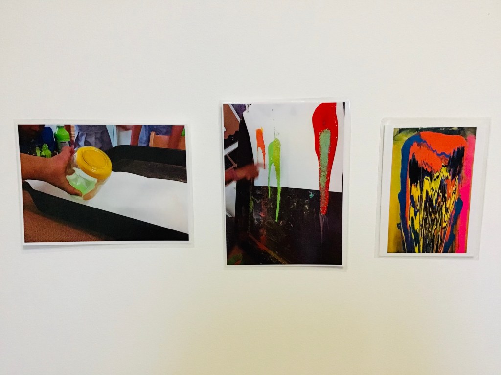We used the book Frank Bowling: An Art Activity Book by Helene Baum and Zoe Whitely (2019) to help us explore ‘action’ words we might use when creating the work (and we made some actions to go with the words too) such as ‘drizzle’, ‘splatter’, ‘pour’ and ‘spill’.